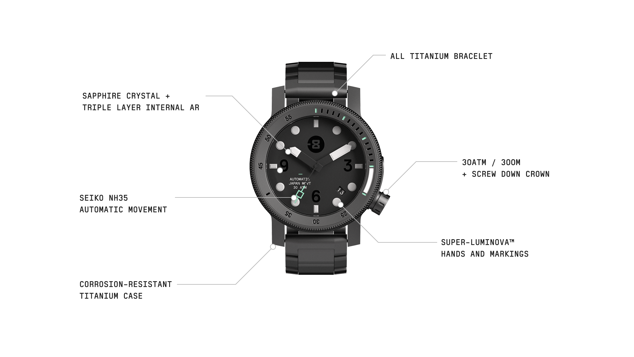 Corrosion resistance and reliability are Dive watch musts. So we use premium lightweight titanium for the case and the bracelet to ensure the Diver is dependable and ready to perform in harsh environments.